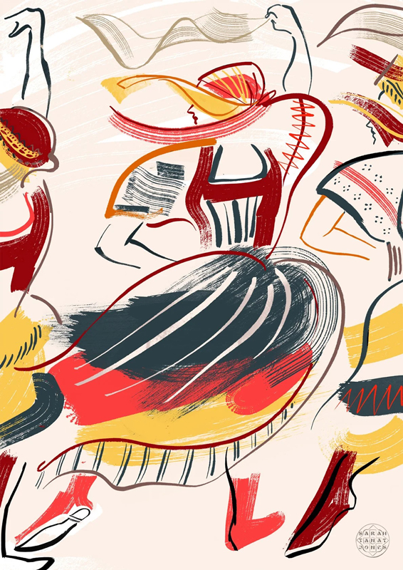 Sarah is an award-winning illustrator based in the creative, vibrant city of Bristol, working across editorial, publishing and advertising. Bringing a very distinctive and artistic flair to her compositions, Sarah's unique illustration style is defined by its energetic and expressive line work paired with bold textures and rich colours, always allowing space for spontaneity. Blending digital and traditional methods, Sarah begins each image with fluid ink drawings on paper which she then colours digitally or with the addition of hand-painted layers inspired by silkscreen techniques, to create her stylised images and stunning portraits. Outside of illustration, Sarah is a talented singer and musician - playing the drums and is also mum to two small boys.