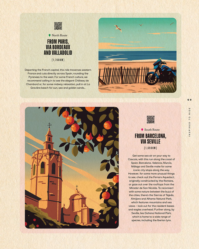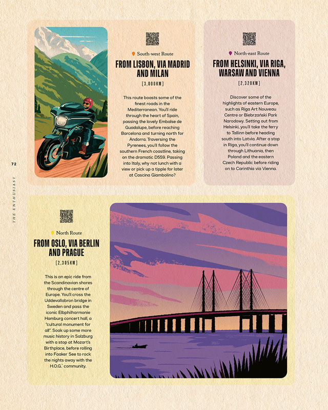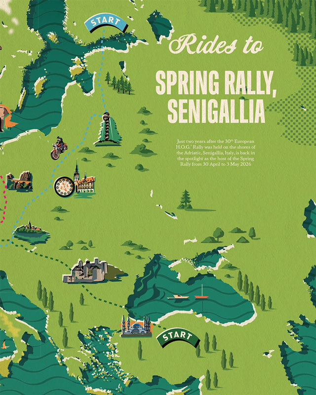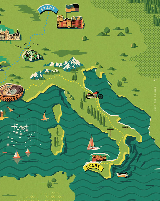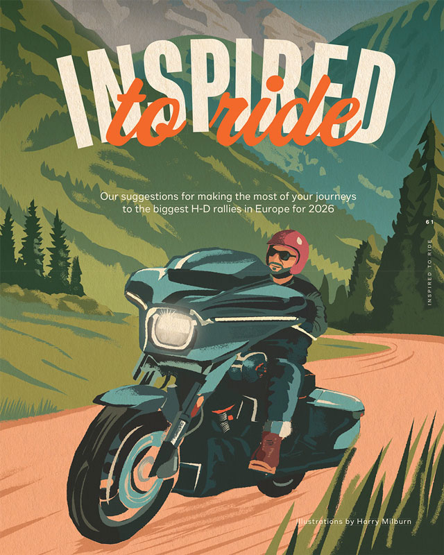 Commissioned to design the cover, maps, and a wide range of illustrations showcasing landmarks, attractions and Harley-Davidson’s iconic motorbikes, Harry Milburn loved bringing Inspired to Ride to life for The Enthusiast in his modern heritage style. To see more of Harry's work, click here.