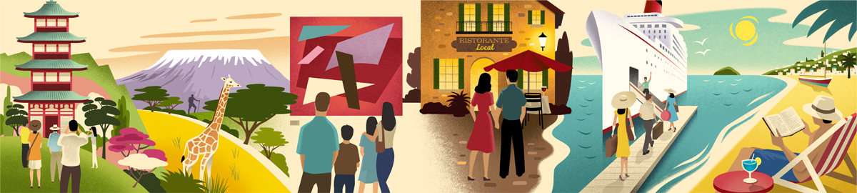 Michael Crampton worked with Boundless magazine to create a stress free guide to booking the perfect holiday. Michael illustrated a series of destinations in his stunning retro style, to help readers book the ideal break. To see more of Michael’s work, click here.